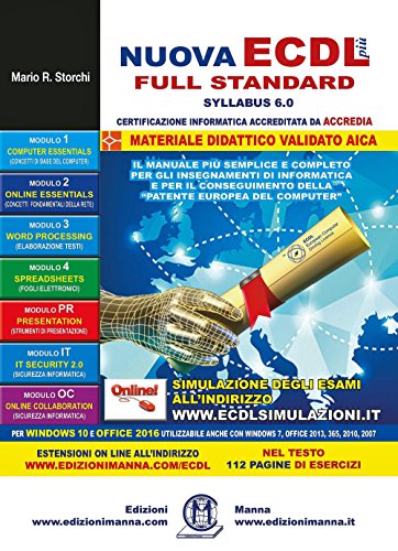 Il manuale per gli insegnamenti di informatica e per il conseguimento della "patente europea del computer". Fornisce tutte le conoscenze e le abilità necessarie per sostenere e superare gli esami: Computer Essentials; Online Essentials; Word Processing; Spreedsheets; Presentation; IT Security; Online Collaboration. Materiale didattico validato da AICA. Certificazione informatica accreditata da ACCREDIA. Simulazione degli esami online all'indirizzo www.ecdlsimulazioni.it con migliaia di item randomizzati e senza limiti di utilizzo. 112 pagine di esercizi di comprensione. Estensioni on line all'indirizzo www.edizionimanna.com/ecdl
